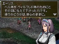 Valkyrie Profile: Covenant of the Plume is a tactical role-playing game in which players take on the role of main protagonist Wylfred and a group of allies for turn-based tactical combat in three-dimensional isometric areas with a rotatable camera angle.[1][2] The screens of the Nintendo DS display different information, with the top screen showing battle information and the bottom showing the story, map and battle sequences.[3][4]