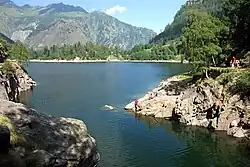 Water in the Antrona Valley is a significant resource; streams and lakes abound. The Ovesca river, from its headwaters at Lake Antrona, runs the entire course of the valley. Lake Antrona was formed naturally following a landslide in 1642; its main tributary is the Troncone from the Pizzo d'Antigine. Shortly before flowing into Lake Antrona, the waters of the Troncone are dammed, creating the artificial Lake Campliccioli and used for hydroelectric power. Another artificial lake is Lake Cingino, located at 2,262 m above sea level. It is famous for its Alpine Ibex, who ascend the nearly vertical wall of the dam to lick salts (saltpeter).[2]