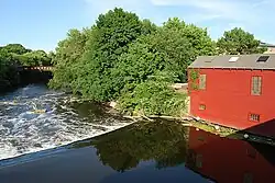 The 1855 brick mill on the southern, Central Falls side still remains, having been converted into senior housing in 1979;[3] it is listed on the National Register of Historic Places. It ranks as one of the earliest mill conversion projects in New England. Although the older mill closer to the river has been significantly altered and a large addition was built east of the main mill, it is still possible to observe the original power trench which flows through the mills, as well as the original brick mill tower. The gate house that directed water into the trench still stands by the dam. A similar structure once stood in the park on the Cumberland side of the falls, but is no longer standing. Parts of its foundation are still visible, as is the northern power canal.
