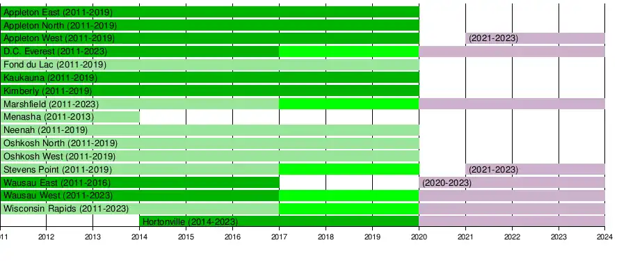 In 2014, Hortonville replaced original member Menasha, who departed the VFA for the Bay Conference.[3] Three years later, Wausau East left the VFA to compete as an independent school for football, prompting the realignment of the conference into three five-team divisions:[4]