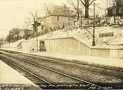 Valley Road opened on December 21, 1929, along with Central Avenue and Mattapan as the second phase of the Mattapan Line.[2] Like Capen Street (opened in 1930) and Butler (1931), it had not previously been the site of a railroad station.[3] In 1932, local politicians advocated for the construction of a footbridge across the Neponset River to provide transit access to the Boston Consumptives Hospital from the station.[4] The bridge was not built; until the Harvest River Bridge carrying the Lower Neponset River Trail was built about 0.2 miles (0.3 km) west in 2016, there was no pedestrian crossing of the river between Mattapan Square and Central Avenue.[5]