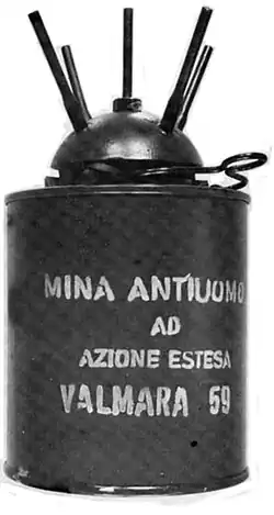 The Valmara 59 is a large cylindrical Italian bounding anti-personnel mine. It is the first in the "Valmara" family of mines produced by Valsella Meccanotecnica, and was followed by the Valmara 69 and VS-JAP. The mine's body is plastic with a distinctive five-pronged metal head. The central prong has a hole, to allow the threading a trip wire. The inner body of the mine has a main charge surrounded with approximately 1,000 steel cubes, below which is a steel wire connecting it to the base of the mine. When the mine is triggered a small charge launches the mine into the air approximately 45 cm before the steel wire is pulled taut, the jolt of which pulls a striker into the detonator. A secondary time fuse triggers the mine after three seconds if it has not detonated after being triggered.