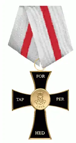 The Valour Cross decoration is a silver cross pattée with a gilded edge, the lower arm being longer than the others. On the obverse in the center of the cross is a gold medallion with HM The Queen's monogram above the year 2010. Each of the four arms of the cross bear three letters each of the inscription FOR TAPPERHED (meaning "for valour"). The reverse is engraved with the name and grade of the recipient, as well as the location and year of the event for which they were honoured.[1]