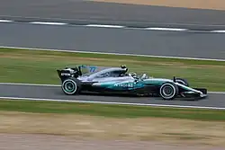 Bottas qualified and finished third in his first race as a Mercedes driver, the Australian Grand Prix, behind Sebastian Vettel and Lewis Hamilton.[73] At the Chinese Grand Prix, he spun behind the safety car and fell from fifth to 12th but recovered to sixth place by the finish.[74] He qualified fastest ahead of Hamilton at the Bahrain Grand Prix, marking his first career pole position.[75] Tyre pressure issues during the race contributed to him falling behind Vettel and Hamilton to finish third.[76] He qualified third behind the two Ferraris of Vettel and Räikkönen at the Russian Grand Prix, but overtook both on the opening lap and went on to claim his first Grand Prix victory, making him the fifth Finnish driver to do so.[77] He was able to continue after a first-lap collision with Räikkönen and Max Verstappen at the Spanish Grand Prix, but later retired from third place with an engine failure.[78] He benefited from damage to Vettel's car to finish second behind Hamilton at the Canadian Grand Prix[79] and followed this with a recovery drive at the Azerbaijan Grand Prix; a first-lap collision with Räikkönen had put him a lap behind but the red-flag period and multiple safety cars allowed him to catch up and pass Lance Stroll for second place metres before the finish line.[80]