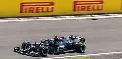Bottas qualified seventh at the Russian Grand Prix but was again demoted to the back after another engine change.[177] A well-timed pitstop for intermediate tyres on the rapidly dampening track promoted him to fifth place at the end.[178] He qualified second at the Turkish Grand Prix but started on pole after Hamilton incurred a grid penalty. He went on to claim his first and only victory of the year by passing Charles Leclerc for the lead after pitting,[179] a win he described as one of his best ever.[180] Another engine penalty came at the United States Grand Prix causing him to start ninth;[181] he gained places to finish sixth.[182] He claimed pole position at the Mexico City Grand Prix, but a slow start and contact with Daniel Ricciardo dropped him to the back. He was later brought into the pits multiple times for soft tyres in order to deny Max Verstappen the bonus point for the fastest lap, which was successful.[183] He qualified third at the São Paulo Grand Prix and benefited from Hamilton's disqualification and an overtake on Verstappen to win the sprint qualifying session,[184] but ultimately dropped behind both drivers in the race.[185] He received a grid penalty at the Qatar Grand Prix for a yellow-flag infringement and ultimately retired from the race with puncture damage,[186] but followed this with a podium finish at the inaugural Saudi Arabian Grand Prix after passing Esteban Ocon metres before the finish line.[187] He ended the season by qualifying and finishing sixth at the Abu Dhabi Grand Prix.[188]