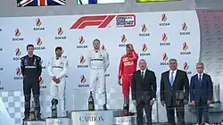Bottas was promoted to the podium at the Italian Grand Prix after Max Verstappen received a penalty for colliding with him.[105] He claimed pole position at the Russian Grand Prix but was ordered by Mercedes to concede his position to Hamilton during the race. Hamilton later indicated that he was unhappy with the order, but Wolff remarked that maximising Hamilton's championship points was the "harsh reality", with Bottas commenting "Lewis is fighting for the drivers’ championship and I'm not".[106][107] The Japanese Grand Prix was his eighth and final podium finish of the year, and he finished fifth at each of the remaining four races.