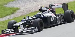 In November 2012 it was announced that Bottas would replace Bruno Senna and partner Pastor Maldonado as a full-time Williams race driver for the 2013 season.[16] He qualified 16th, ahead of Maldonado, and finished 14th at his debut race, the Australian Grand Prix. He improved from 18th on the grid to 11th at the finish at the Malaysian Grand Prix, 1.5 seconds behind a points-paying position.[17] He qualified third at the Canadian Grand Prix behind Sebastian Vettel and Lewis Hamilton, the first time a Williams car had qualified in the top ten that year.[18] He was unable to hold the position in the race and dropped to 14th at the finish line. He later stated that "the car pace was just not there" and that he believed the result would have been the same regardless of the team's strategy.[19] A hydraulics failure at the Hungarian Grand Prix caused his first retirement of the season whilst Maldonado finished tenth to claim the team's first point of 2013. Bottas qualified ninth and finished eighth at the United States Grand Prix, his first Formula One points and the team's best result of the season.[20] He collided with Hamilton whilst unlapping himself at the season-ending Brazilian Grand Prix, later stating he was unaware Hamilton was a lap ahead.[21]