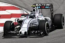 Bottas was retained by Williams for the 2014 season, partnering Felipe Massa who was signed from Ferrari.[25] At the season-opening Australian Grand Prix, Bottas started fifteenth due to a gearbox change penalty[26] and clipped the wall causing a tyre puncture in the race, but recovered to sixth at the finish and was later promoted to fifth after Daniel Ricciardo's disqualification.[27] He received another grid penalty and started 18th at the next race, the Malaysian Grand Prix, for impeding Ricciardo in qualifying, but gained places to finish eighth. He matched his best grid position at the Bahrain Grand Prix, starting third, but dropped to eighth at the finish. He praised the team's updates to his FW36 after finishing fifth at the Spanish Grand Prix and felt that the team now had the third-fastest car,[28] however this was followed by 13th place in qualifying and an engine failure at the Monaco Grand Prix.