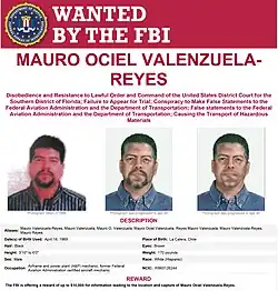 In 1997, a federal grand jury indicted SabreTech for mishandling hazardous materials, failing to train its employees in proper handling of hazardous materials, conspiracy and making false statements. SabreTech's maintenance supervisor Daniel Gonzalez and two mechanics who worked on the plane, Eugene Florence and Mauro Ociel Valenzuela-Reyes, were charged with conspiracy and making false statements. Two years later, having been found guilty on the mishandling hazardous materials and improper training charges, SabreTech was fined $2 million and ordered to pay $9 million in restitution. Gonzalez and Florence were acquitted on all charges, while Valenzuela failed to appear and was indicted in absentia for contempt of court.[18] A warrant was issued for Valenzuela's arrest in 2000, and he remains a fugitive as of 2025. In 2010, he was specifically highlighted in the EPA's announcement of a website to search for "environmental fugitives."[19][20] The FBI has offered a $10,000 reward for information on his whereabouts.[21][22]