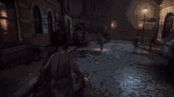 Reid can wield improvised melee weapons, such as a saw, as well as ranged weapons including the Webley Revolver.[4][25] Being able to use three-hit combos, dodge rolls, and parrying,[6] he can fight against other vampires like him—aristocrats who go by the name of Ekon; sewer-dwelling vampires known as Skals; the Vulkod—a stronger breed of vampire resembling werewolves; Nemrod—vampires who hunt their own kind;[26] and the Guard of Priwen—a secret society of vampire slayers.[27] Boss fights are featured,[7] and in some cases mandatory.[28] Reid is adaptable to other vampire features, like the claws of a Vulkod.[26] Weapon improvement through crafting is made possible by looting items. While using vampiric powers in combat, the character's blood bar drains. This forces him to feed so he can immediately replenish his strength.[3][21] With the vitality attained from killing a human being, he can boil the blood of his enemies, cast blood spears,[29] throw mist bombs, and turn invisible.[6] He uses his control of shadows to hide himself and strike at his opponents.[26] He can use "Spring" to scale locations and charge rapidly across gaps,[2][9] which is also useful for avoiding combat.[30]