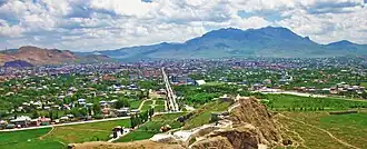Under the ancient name of Tushpa, Van was the capital of the Urartian kingdom in the 9th century BCE. The early settlement was centered on the steep-sided bluff now known as Van Castle (Van Kalesi), close to the edge of Lake Van and a few kilometers west of the modern city. Urartian cuneiform inscriptions dating to the 8th and 7th centuries BCE have been found here. The name 'Van' comes from the Urartian endonym Biaina.[8] A "conservative" estimate by Charles A. Burney put the population of Tushpa and its suburbs at 50,000.[9][10]