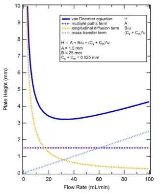 The van Deemter equation in chromatography, named for Jan van Deemter, relates the variance per unit length of a separation column to the linear mobile phase velocity by considering physical, kinetic, and thermodynamic properties of a separation.[1] These properties include pathways within the column, diffusion (axial and longitudinal), and mass transfer kinetics between stationary and mobile phases. In liquid chromatography, the mobile phase velocity is taken as the exit velocity, that is, the ratio of the flow rate in ml/second to the cross-sectional area of the ‘column-exit flow path.’ For a packed column, the cross-sectional area of the column exit flow path is usually taken as 0.6 times the cross-sectional area of the column. Alternatively, the linear velocity can be taken as the ratio of the column length to the dead time. If the mobile phase is a gas, then the pressure correction must be applied. The variance per unit length of the column is taken as the ratio of the column length to the column efficiency in theoretical plates. The van Deemter equation is a hyperbolic function that predicts that there is an optimum velocity at which there will be the minimum variance per unit column length and, thence, a maximum efficiency. The van Deemter equation was the result of the first application of rate theory to the chromatography elution process.