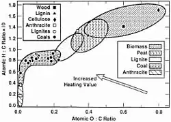 Van Krevelen diagrams are graphical plots developed by Dirk Willem van Krevelen (chemist and professor of fuel technology at the TU Delft) and used to assess the origin and maturity of kerogen and petroleum. The diagram cross-plots the hydrogen:carbon atomic ratio as a function of the oxygen:carbon atomic ratio.