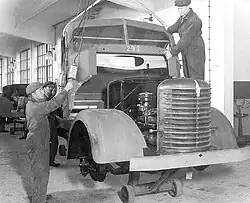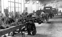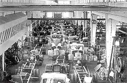 The original factory building, officially a warehouse and assembly hall, had a volume of 25,000 m3 (33,000 cu yd).[8] The facilities were developed over time and by the end of 1953, the floor area was 35,000 m2 (42,000 sq yd). The warehouse and assembly hall were renamed the main hall; it was now 120 m (130 yd) long and 30 m (33 yd) wide. Bus chassis production was located at the southern side of the hall and lorries were built at the northern side. This set-up was often changed depending on the product mix and production volume.[39]