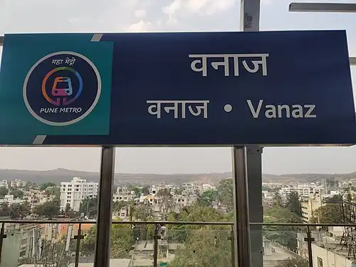 Vanaz is the elevated western terminal metro station on the East-West corridor of the Aqua Line of Pune Metro in Pune, India. The station was opened on 6 March 2022 as an inauguration of Pune Metro.[2] From March 2022 to August 2023, the Aqua Line was operational between Vanaz and Garware College.[3] The extended section between Garware College to Ruby Hall Clinic was inaugurated on 1 August 2023. So the metro operated from Vanaz to Ruby Hall Clinic.[4] Later the remaining stretch was completed and the line operates till Ramwadi from 6 March 2024.[5]