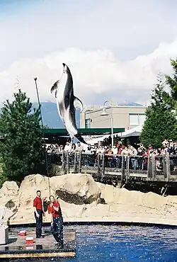 For many years, the primary attraction for visitors was the orca show. The aquarium was the second to capture a killer whale, Moby Doll, who was displayed for a day at Burrard Dry Dock on July 18, 1964.[18] Subsequently, the public was kept away from him, however.[19] Since then, it was home to Skana (at first called Walter), Hyak II, Finna, Bjossa, and three of Bjossa's calves. When Finna died and Bjossa was left without other orca companions, the aquarium attempted to acquire one or more female orcas from other marine parks. However, no suitable companions were found, and Bjossa was moved to SeaWorld, San Diego, in April 2001 where she later died due to a chronic respiratory illness. The aquarium has since moved to emphasize the educational aspects of the displays rather than the public spectacle of the shows. They have also highlighted their research, rescue and rehabilitation efforts.