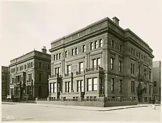 Immediately east of the Triple Palace, Fifth Avenue was widened in 1911, and Frick's driveway was cut back.[12] In addition, the flower plantings and stone railing in front of the Triple Palace's northern section were removed.[64] Around that time, the neighborhood was growing increasingly commercial.[86][87] When George Vanderbilt unexpectedly died in 1914,[88] the house passed to Cornelius Vanderbilt III, the next grandson of W.H. Vanderbilt, as George had no male heirs.[84][89][c] Cornelius III took possession of the house that April.[90] He requested Frick vacate the property, giving him several months to move. The Fricks moved to the Henry Clay Frick House in June 1914, where they remained until their deaths.[84]