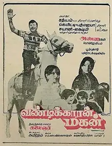 Vandikkaran Magan (transl. Cartman's son)[1] is a 1978 Indian Tamil-language film photographed and directed by Amirtham, and written by M. Karunanidhi. It is based on the play of the same name by C. N. Annadurai.[2] The film stars Jaishankar, M. R. Radha and Jayachitra. It was released on 30 October 1978 and became a major success. The film was remade in Telugu as Ammayi Mogudu Mamaku Yamudu (1980).[3]