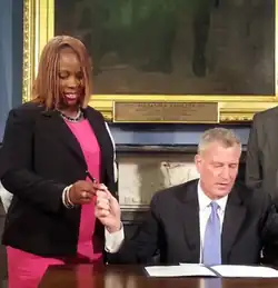 Gibson responded to the 2015 Bronx Legionnaires' disease outbreaks that primarily plagued her constituents. She worked with Mayor Bill de Blasio, Speaker Melissa Mark-Viverito, Bronx Borough President Ruben Diaz, Jr., the Department of Health and Mental Hygiene (DOHMH), among many other New York City authorities to investigate the cause of the outbreak and implement prophylactic legislation accordingly.[16] On August 18, 2015, Gibson stood alongside the Mayor as he signed Local Law 866 (Int 0866-2015),[17] a historical legislation that mandates cooling tower registration and regulates the maintenance of citywide towers.[16]