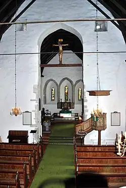 The church has a rectangular nave measuring about 18 by 13 metres (59 ft × 43 ft) and a smaller, narrower choir measuring about 10.4 by 9.6 metres (34 ft × 31 ft). It does not have a sacristy, porch, or tower. The stone walls of the church are all 6 metres (20 ft) high and are also about 1.3 to 1.6 metres (4 ft 3 in to 5 ft 3 in) thick. The ceiling of the church reaches 18 metres (59 ft) high at the highest point. The church has a hexagonal pulpit from the early 17th century. It is decorated with painted tulips, brass ornaments, and pilasters in green, yellow and red against a pale yellow background.[4][3][5]