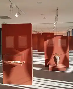 The fourth phase at Vani runs from c. 250 BC to c. 47 BC.[14] This was the period of relative decline in central Colchis: many settlements disappeared as did rich burials. The Vani site saw the erection of a strong circuit wall, with towers and a heavily defended gate,[16] built of mudbrick on a stone socle.[14] Around 150 BC, much of the city was destroyed as evidenced by dating the stamped Rhodian amphorae unearthed at Vani. By the end of the 2nd century BC, there was renewed building activity: parts of the ruins were methodically levelled and new buildings were constructed. The northern part of the hill was dominated by the gate and defensive structures and the lower terrace housed a large temple complex.[17] The large buildings of the city were decorated with Corinthian capitals and lion-head waterspouts. Hellenistic statues in bronze attest to the impact of Greek culture.[18] According to Lordkipanidze, Vani became a city-sanctuary similar to the temple communities of ancient Anatolia;[14] David Braund argues there is the lack of evidence and identification of the function of many buildings at Vani is problematic.[19]