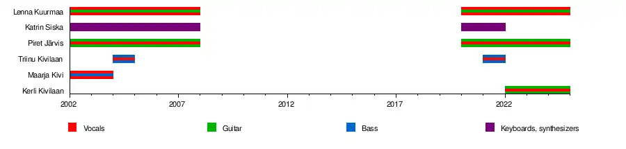 The band was originally a four-piece group consisting of Maarja Kivi, Lenna Kuurmaa, Katrin Siska and Piret Järvis. Maarja Kivi left the group in 2004 and was replaced by Triinu Kivilaan. In December 2005 she also left the group to start a solo career and finish school, and the band decided to continue as a three-piece act. Triinu rejoined for their 2021 album 'Encore'. Katrin and Triinu left the band 2022.[6]