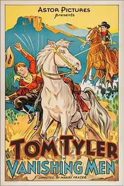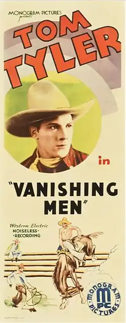 In 1931, the newly formed Monogram Pictures announced the titles of its first 28 films, to be produced and released over the following year, including eight Westerns starring Tom Tyler.[b][4][5] Vanishing Men was released in the United States on April 15, 1932,[1] and in the UK on June 3.[6] In 1937, the film was re-released by Astor Pictures.[1]