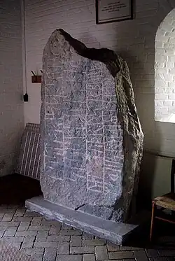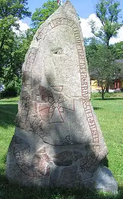 This is not properly a runestone but a runic inscription in style Pr4 that has been carved into flat bedrock at Veda. It is dated to the mid-11th century.[37] It was ordered by Þorsteinn who enriched himself in the lands of Rus' in memory of his son. Omeljan Pritsak identifies this Þorsteinn with Þorsteinn, the former commander of a retinue,[38] who is commemorated on the Turinge Runestone.[39][40] He suggests that Þorsteinn was the commander of the retinue of Yaroslav the Wise and that his son Erinmundr may have died in Garðaríki while serving under his father.[41]