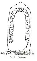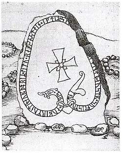 - ^ Runor G 134, section Inscription, English: "Hróðvísl and Hróðelfr, they had the stones raised in memory of (their) three sons. This (one) in memory of Hróðfúss. Wallachians betrayed him on a voyage. May God help Hróðfúss' soul. May God betray those who betrayed him."