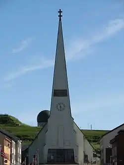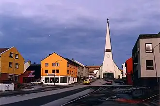 Vardø Church (Norwegian: Vardø kirke) is a parish church of the Church of Norway in Vardø Municipality in Finnmark county, Norway. It is located in the town of Vardø on the island of Vardøya. It is the main church for the Vardø parish which is part of the Varanger prosti (deanery) in the Diocese of Nord-Hålogaland. The white, modern, concrete church was built in a long church style in 1958 by the architect Eyvind Moestue. It has a high roof with a steep pitch, with a tall triangular steeple. The church seats about 432 people.[1][2]