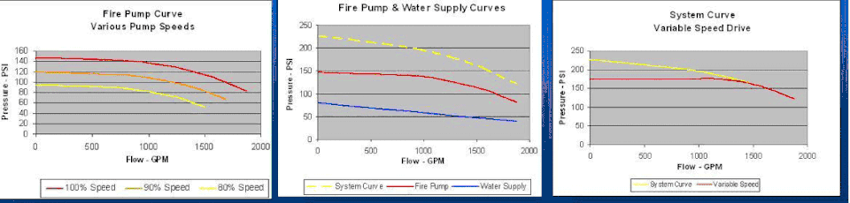 - Energy Savings – "Most motors turn at nearly constant speed. However, much of the time the devices they drive operate at less than maximum design speed. This reduction can be accommodated by an Adjustable Speed Drive (ASD) that varies the shaft speed to the driven load. Slowing a pump or motor in this manner reduces the energy consumption much more effectively than allowing the motor to run at constant speed and then restricting or bypassing the flow with a valve or damper...if shaft speed is reduced 10%, flow is reduced by 10%, while power consumption is reduced 27%."[6] However, due to the limited operating hours of a fire fighting pump, the total energy savings will be minimal for this type of application, compared to the initial investment.