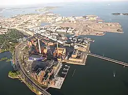 Ruoholahti from a hot air balloon in 2010. Varma's main office in Salmisaari is in the foreground. | |