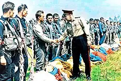 The main force in the operation was the Soviet contingent, made up of the complete 106th Airborne Landing Division of the VDV, which carried out an airborne landing en-masse in the mountainous region of the Rhodope Mountains (hence the name) and the 309th Separate Marine Infantry Battalion of the Black Sea Fleet, which carried out an amphibious landing in Varna and immediately deployed over 300 km overland to join up with the 106th.[18] The overall commander of the operation was the Bulgarian Minister of People's Defence Army General Dobri Dzhurov, but Col-Gen. Margelov was the person actually in charge. The operation was a success and later that year on 28 October 1967 Margelov was promoted to general of the army. He organized the Soviet airborne operations during the Warsaw Pact invasion of Czechoslovakia. From January 1979, he was in the Group of Inspectors General of the Ministry of Defence. Margelov was the chairman of the State Examination Commission of the Ryazan Airborne School. Margelov lived in Moscow and died on 4 March 1990 at the age of 82.[19] He is buried in the Novodevichy Cemetery.[13]