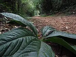 The main attraction of the park is a giant jequitibá-rosa tree in the well-preserved cerrado of the 900 hectares (2,200 acres) Pé de Gigante section, which takes its name from a great depression in the interior shaped like a giant's foot.[2] The tree, called "O Patriarca" (The Patriarch), is estimated to be 600 years old based on comparison to a neighboring jequitibá whose rings were counted and whose trunk was studied using carbon 14 dating, which gave an age of 400 years. O Patriarca is larger and has a thicker trunk, from which the age of 600 years is estimated.[4][a] It is 3.6 metres (12 ft) in diameter, 40 metres (130 ft) high and has a circumference of 11.5 metres (38 ft). Its deepest root goes down to 18 metres (59 ft) and its longest extends 30 metres (98 ft) to the side. Its gross weight has been estimated at 264 tons.[2] The park holds about 330 specimens of this rare and imposing tree species.[7]