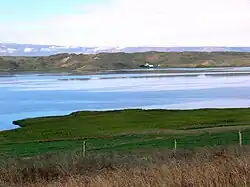 At the northeast mouth of the Vatnsdalur is a 2.6 km2 (1.0 sq mi) lake called Flóðið ('The Flood'). A landslide lake, it was formed on 8 October 1720 by the Bjarnastaðaskríða – the 'Bjarni rockslide,' so named because it destroyed the Bjarnastaðir farm – when skree (skríða) and other debris falling from the Vatnsdalsfjall caused the Vatnsdalsá to be dammed and flood the grassy wetland that was previously found there.[2] Records describe three ponds in the area immediately prior to the formation of Flóðið – called Hólatjörn, Körtjörn, and Breiðabólstaðartjörn – which were submerged in the flood and absorbed into the newly created lake.[3]