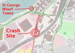 At 07:59 GMT, the helicopter collided with the jib of a construction crane attached to St George Wharf Tower in Vauxhall. The existence of the crane was subject to a Notice to Airmen (NOTAM),[Note 1] but the investigators were unable to ascertain whether or not the pilot was aware of the NOTAM. Although the pilot would have seen the building when he previously flew in to Battersea, it was not on the database of the GPS system in use in the helicopter, as that had not been updated since May 2012.[7] The impact sent the helicopter plunging towards the ground, where it caught fire, killing the pilot and pedestrian Matthew Wood.[2][3]