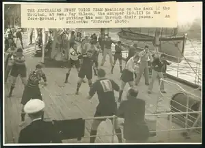 The Whiticker reference records that "the squad played an exhibition match in Bombay on the journey home so that the players could be afforded international status".[5] However rugby league historian Sean Fagan casts doubt on this, citing his 1998 interview with squad member Len Smith wherein Smith advised that the game was played between one-half of the touring squad against the other with extra numbers made up by some military personnel on hand in Bombay. This is supported by the Pollard reference which records that the Wallabies played against a "Gymkhana XV made up of military men and others".