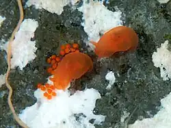 This red-orange nudibranch can grow up to 6mm in size.[3] It reproduces by direct development and lays an egg mass of 3-5 eggs.[3]