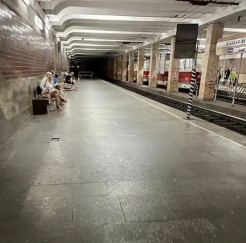 Vechirnii Bulvar (lit. 'Evening Boulevard', Ukrainian: Вечірній бульвар) is a station on the Kryvyi Rih Metrotram. Opened as part of the first stage on 26 December 1986, it was the first proper Metro-type underground station in the system. Located in the middle of a tunnel stretch that is of 2.3 kilometers in length which was built to avoid physically dividing the Microdistrict 6 by the Metro tracks, as the original 1970s designs called for.