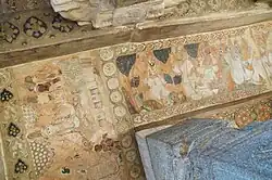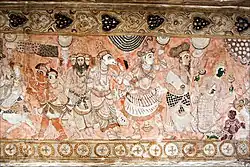 The paintings in each bay on the ceiling of the main mandapa, the antarala and other shrines, depict the grandeur of Vijayanagara pictorial art. They are painted over an initial plaster layer of lime mortar. The colour scheme consists of vegetable and mineral colours of yellow, ochre, black, blue and green blended with lime water; the background is generally painted in red colour. Apart from figures of gods and goddesses, in the presence of the devotees arranged in rows, the frescoes also depict the incarnations of Vishnu.[11] The paintings are in striking compositions where the particular emphasis is on the period costumes and facial expressions.[4]