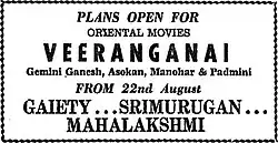- ^ "Veeranganai". The Indian Express. 18 August 1964. p. 3. Retrieved 28 October 2024 – via Google News Archive.