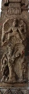 Appar's sister Thilakavathiyar settled here during her later years and devoted her lifetime service to Shiva. Afflicted by a painful illness, Thirunavukkarasar, who was originally called Dharmasenar and was then a staunch follower of Jainism, prayed for relief at this temple where his sister Thilagavathiyar served. By the divine grace of Shiva, he was cured. He embraced Saivism from then and started canonizing various temples with his verses.[14] The ruling Pallava king namely Kadava punished Thirunavukarasar in various ways and finally dropped him in a lime kiln. He was subsequently cast on the waters of sea, where he started floating and was pushed ashore in Thirupathipuliyur. It is believed that some of his best songs were sung at this time in praise of the presiding deities at Padaleeswarar temple and Veerateneeswarar temple. Thirunavukkarasar came back to Thiruvathigai from Thirupathripuliyur. Influenced by the greatness of the poet, the king himself converted to Shaivism from Hinduism.[15] Appar venerated Veerateeswarar in seventeen verses in Tevaram, compiled as the Fourth Tirumurai, Fifth Tirumurai and Sixth Tirumurai. The Soolai Kinaru, a well in the temple is believed to be the limestone well where Appar was dropped by the Jains. Though the actual location was in Cuddalore, the well is maintained as an indicative example of the event. The water from the well is taken by people suffering from stomach related ailments.[8]