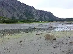 The southwestern part of the island is mountainous, with the highest point being the 803-metre (2,635 ft) tall Trollvasstinden. The rest of the island is rather flat and marshy.[2]