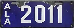 1911–12 | White serial on blue porcelain plate; vertical "ALA" at left | none | 1234 | 1 to approximately 4000 | |