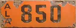 The state first issued annual license plates on October 1, 1911, with plate #1 being issued to the Leak Funeral Home in Montgomery.[1] Until 1980, the license year was October 1 to September 30. Porcelain plates were originally used, before the state switched to embossed metal plates in 1915. The 1916–17 plate was the first to feature the year of expiration, while the 1921–22 plate was the first to use a horsepower class system, with each class denoted by a letter.[3] Kilby Prison near Montgomery took charge of all plate manufacture in 1928.[1]