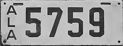 1916–17 | Embossed red serial on white plate; vertical "ALA" and "1917" at left and right respectively | none | 12345 | 1 to 25000; 35001 to approximately 36600 |