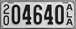 1919–20 | Embossed black serial on white plate with border line; vertical "20" and "ALA" at left and right respectively | none | 12345 | 00001 to approximately 64700 | |