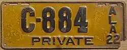 1921–22 | Embossed black serial on yellow plate with border line; vertical "ALA" and "22" at right; "PRIVATE" centered at bottom | none | A-12345 | Coded by horsepower class (A) | |