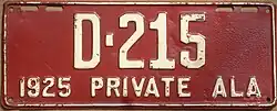 1924–25 | Embossed white serial on red plate with border line; "1925 PRIVATE ALA." at bottom | none | A-123-456 | Coded by horsepower class (A) | |