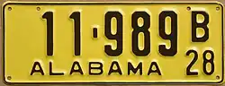 1927–28 | Embossed black serial on yellow plate with border line; "ALABAMA" at bottom, offset to left; "28" at bottom right | none | 123-456A | Coded by horsepower class (A) | |